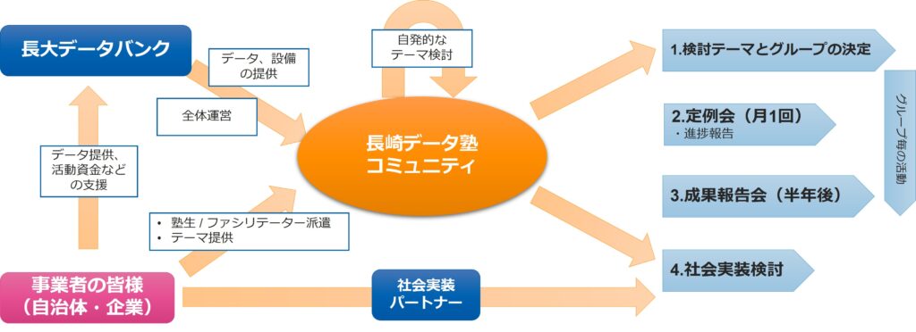 長崎データ塾では、産官学、法人・個人、社会人・学生を問わず、様々な分野の方々を「塾生」として集めたコミュニティとして、長崎の社会課題に関する検討テーマ毎に塾生のグループを構成。様々なパートナーとのつながりを開拓しながら、解決提案とその社会実装を目指したデータ活用を実践します。